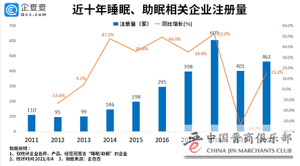 数据显示,从近十年睡眠/助眠相关企业发展状况来看,2018年是企业注册量的最多的一年,全年共注册了605家企业,同比增长了52.0%。2020年注册量为462家,同比下跌了15.2%。