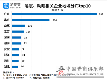 从地域分布来看,数据显示,目前我国现存的睡眠/助眠相关企业主要分布在广东、北京、山东等省份。其中广东拥有最多的睡眠/助眠相关企业,共867家排全国第一。北京排名第二,共384家相关企业;山东排名第三,有136家相关企业。