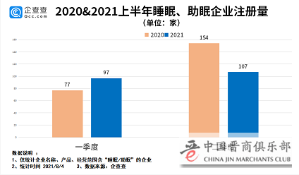 从今年的注册量来看,2021年上半年,我国睡眠/助眠相关企业注册量为204家,同比下跌了11.7%。从各季度注册量来看,今年一季度和二季度的注册量分别是97家、107家。