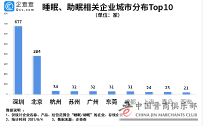 从各城市分布来看,数据显示,目前我国现存的睡眠/助眠相关企业主要集中在深圳北京、杭州等城市。其中深圳拥有最多相关企业,共677家排全国第一。北京排名第二,共384家相关企业;杭州排名第三,有34家相关企业。此外,一线城市广州、上海均排名城市前十之列。