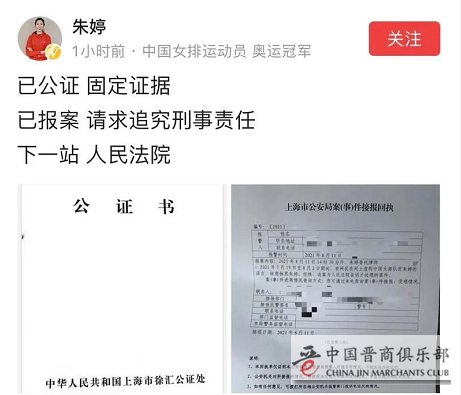 中国女排队长朱婷11日晚在个人社交媒体贴出《上海市公安局案(事)件接报回执》以及公证书首页,并配文:“已公证,固定证据。已报案,请求追究刑事责任。下一站,人民法院。”