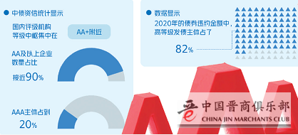 在信用评级体系中,AAA级为最高等级。数据显示,2020年的债券违约金额中,高等级发债主体占了82%。中债资信统计显示,国内评级机构等级中枢集中在AA+附近,AA及以上企业数量占比接近90%,AAA主体占到20%。