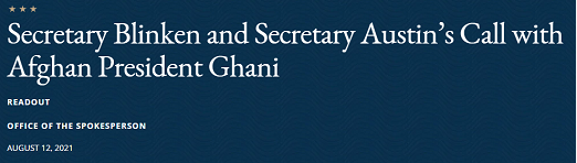 同日,美国国务卿布林肯和国防部长奥斯汀同阿富汗总统加尼通话,称美国正减少在喀布尔的平民活动,但仍强调美国将继续致力于维护阿富汗的安全和稳定。