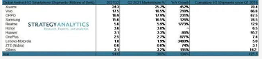 其在中国市场,华为最大的竞争对手——小米获益最大。二季度小米以 26% 的市场份额,2400 万部的出货量引领 5G 安卓智能手机市场。