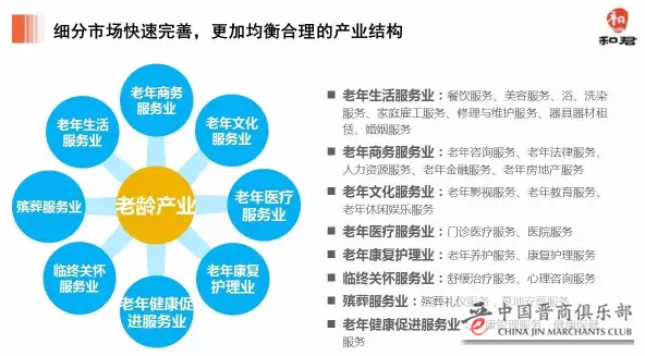 2015年在全国老龄办发布的《老龄产业蓝皮书》中将老龄产业梳理了八大类细分市场85项服务内容,涵盖老年服务业、老年商务服务业、老年文化服务业、老年医疗服务业、老年康复护理业、老年健康促进服务业、临终关怀服务业、殡葬服务业等。陆续,我们观察到越来越多的企业开始找准自身优势,逐渐向专业化细分市场转移,从而为养老产业带来更加均衡合理的产业结构。