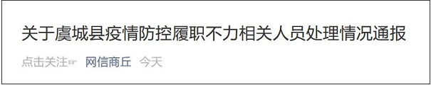 8月16日,“网信商丘”微信公众号发布关于虞城县疫情防控履职不力相关人员处理情况通报: