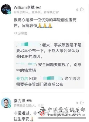 在该文章下方,蔚来创始人、董事长、首席执行官李斌表示,很痛心这样一位优秀的年轻创业者离世。蔚来联合创始人兼总裁秦力洪也留言悼念。