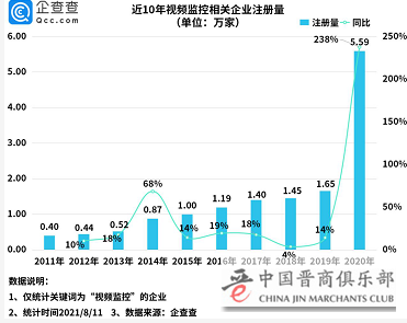 数据显示,从注册量来看,2014年国内视频监控相关企业注册量增长率出现小高峰,同比增长68%,注册量达8700余家;2020年相关企业注册量达历年来最高,达5.59万家,同比增长238%。