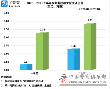 数据显示,今年上半年,国内视频监控相关企业共新增注册量5.25万家,同比增长208%。通过对比分析2020年和2021年上半年相关企业注册量情况发现,今年一季度,视频监控相关企业注册量,达2.34万家,同比增长533%。二季度共新增2.91万家,环比增长24%,同比增长118%。