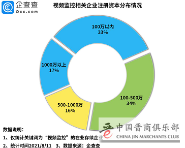 从注册资本来看,数据显示,视频监控相关企业注册资本分布较为均匀,其中注册资本在100万-500万的相关企业数量最多,占比达34%。