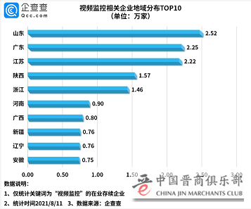 从地域分布来看,数据显示,国内视频监控相关企业主要分布在山东、广东、江苏、陕西等地,其中山东省数量最多,达2.52万家;广东、江苏在第二梯队,分别有2.25家和2.22家。