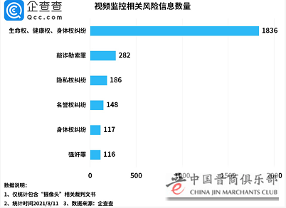 从风险数据来看,数据显示,在文书名称包含“摄像头”的裁判文书中,其中生命权、健康权、身体权纠纷相关的数量最多,共1836份;此外,隐私权纠纷相关的裁判文书也有186份。
