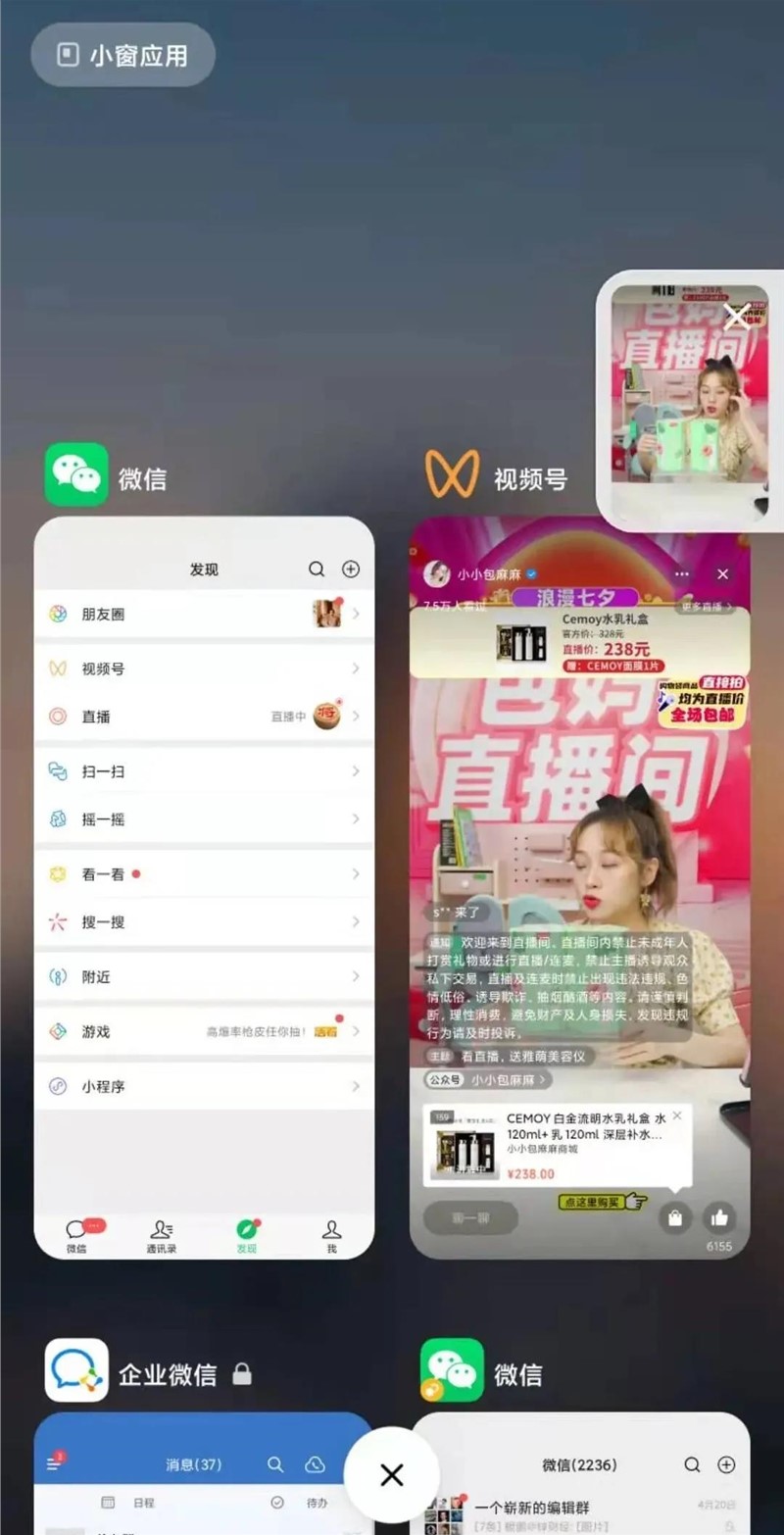 除了支持分屏,独立运作,系统也支持同屏运作,用户可以边观看视频号,边停留在聊天界面功能上,和好友同步聊天。