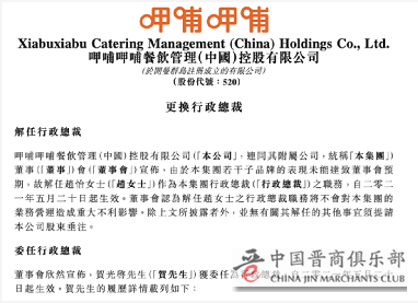 据悉,5月20日,呷哺呷哺宣布解除赵怡行政总裁职务,因该公司若干子品牌表现未达到董事会的预期。同时委任贺光启为行政总裁。