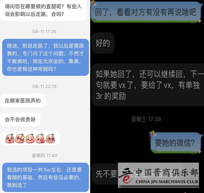 在微信交流时,《财经》记者表达了想瘦小腿的愿望,对方“诚恳”回应无法提供帮助,直言直腿术不能瘦小腿,想瘦小腿得找其它合适的项目,如瘦腿针、小腿吸脂等。经过要求,对方推介了一名“博主”,声称在其牵线之下可以找到合适的医生操作直腿术。在《财经》记者表达了对手术痛感和后遗症的担忧后,对方一再强调:“打麻药睡了就好了,没啥感觉”“什么都怕,什么都改变不了,根本不用担心”。