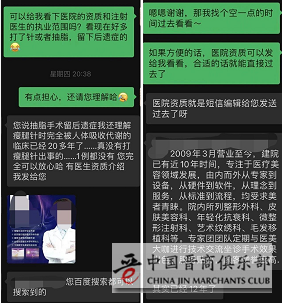 在《财经》记者应允面诊、告知常住地后,这名中介向《财经》记者索要手机号,声称“将手机号录入系统后,可以凭借手机号到对接医院免费面诊”,此后不到三分钟,有三家当地医美机构发信息与《财经》记者联系。