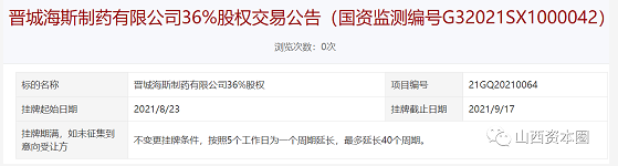 8月23日,山西产权交易市场对外披露晋城海斯制药有限公司36%股权交易公告,公司股东拟以1.19亿元的交易对价转让36%股权,此举意味着筹谋多年的晋城海斯制药混改有望迎来收官时刻。