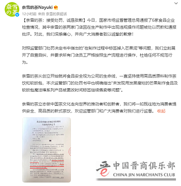 奈雪的茶称,对照监管部门处罚决定书中指出的“在制作过程中标签掉入芒果泥”等问题立刻展开了自查自纠,并要求所有门店员工严格按照生产流程进行操作,杜绝任何不规范行为。