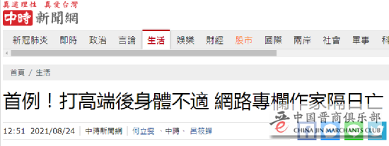 报道称,该名陆姓作家昨天上午10时左右在脸书发文称,一家三口去桃园市大园国际高中接种高端疫苗,并表示自己很荣幸与蔡英文在同一梯次打到高端疫苗,甚至还在留言处向朋友说支持高端,而且科学证实高端最有效也最安全,没想到今天却传出他接种疫苗后死亡的消息。