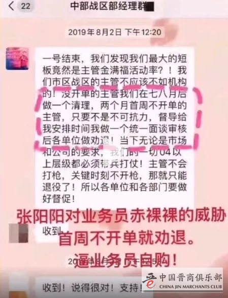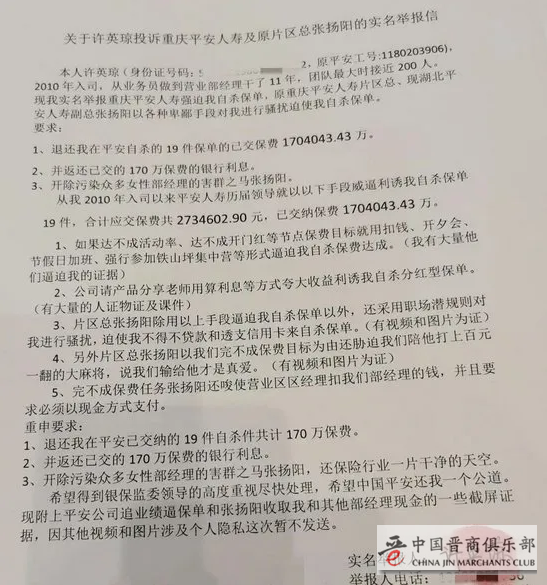 举报信还称,公司会用扣钱、开夕会、节假日加班、强行参加铁山坪集中营等形式逼迫自己购买“自杀单”,除了强迫,还会用算利息夸大收益的方式利诱自己购买“自杀单”。