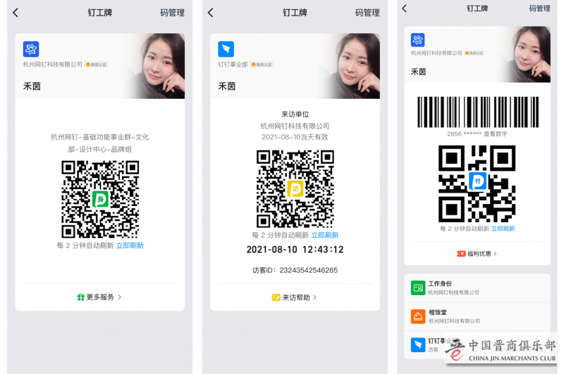 (从左到右依次分别是钉工牌的身份码、访客码、支付码示意图)