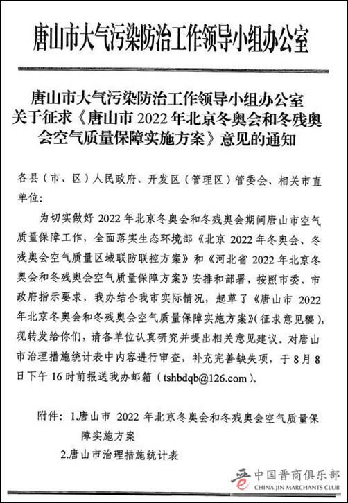 8月初,唐山市大气污染防治工作领导小组办公室发布关于征求《唐山市2022年北京冬奥会和冬残奥会空气质量保障实施方案》意见的通知。图自期货日报