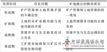 随着煤炭资源城市的发展,不同发展阶段,资源型城市存在的问题不同,矿地融合需要解决的矿地矛盾也不同,见表1。为此,本文提出枯竭型资源城市中矿地融合的内容主要包括产业融合、土地融合、资源融合、全域治理以及城乡统筹五方面。