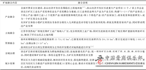徐州作为江苏省唯一的老工业基地和资源枯竭型城市,面对资源日渐枯竭、生态环境恶化、产业结构单一的窘境,创新推进矿地融合发展模式,基于实地调研发现徐州市矿地融合表现,见表3。通过矿地融合的方式实现了废弃建设用地的产业聚集发展、采矿迹地合理再开发利用、塌陷地的复垦修复再利用、废弃矿井的地热开发再利用等,解决了矿工再就业、土地再利用及可再生资源再开发问题,为徐州市关闭矿山矿区带来了新的发展机遇。