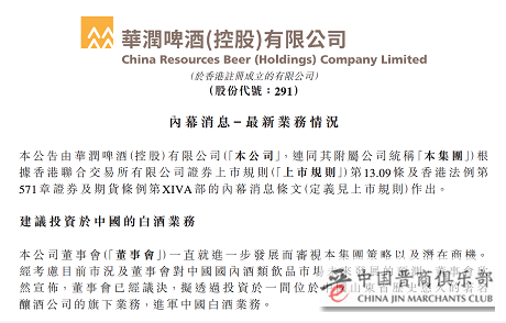 华润啤酒在公告中称,公司董事会一直就进一步发展审视集团策略以及潜在商机。考虑目前市况及董事会对内地酒类饮品市场未来发展的预测,董事会决议,拟通过投资著名酿酒公司的旗下业务,进军白酒业务。