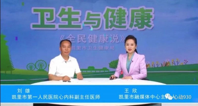 【主持人】观众朋友们,大家好!您现在收看的是由凯里市卫生健康局及凯里市融媒体中心联合推出的《卫生与健康》节目,今天我们将要探讨的话题是高血压防治的健康教育知识,我是凯里市融媒体中心主持人王欣。我们邀请到凯里市第一人民医院心内科副主任刘雄来到我们的演播厅,刘主任欢迎您的到来!