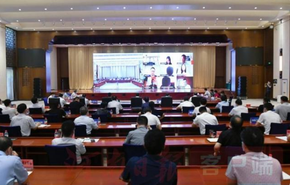 鹤壁市2021年“决战三季度”招商项目网上集中签约仪式现场,鹤壁市委书记马富国与客商连线交流。
