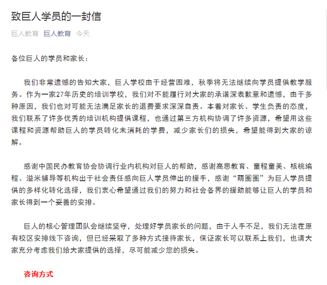 巨人的核心管理团队会继续坚守,处理好学员家长的问题,由于人手不足,我们无法在原有校区安排线下咨询,但已经采取了多种方式接待家长,保证家长可以联系上我们,也请大家充分考虑我们给大家提供的选择,尽可能减少您的损失。