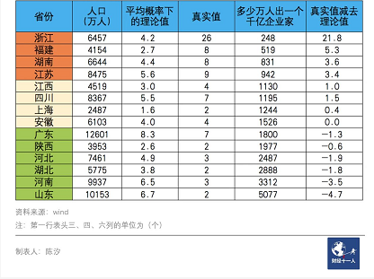 因为各省的人口数量差距悬殊,研究各省产生千亿企业家的概率更为客观,也更有意义。