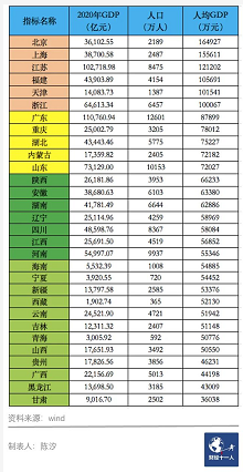表4按照各省2020年人均GDP,从高到底排序。中国2020年人均GDP为72000元,前两个区域的人均GDP高于全国平均值。