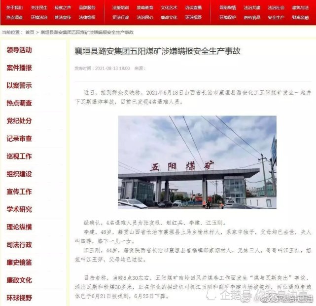 近日,接到群众反映称,2021年6月18日山西省长治市襄垣县潞安化工五阳煤矿发生一起井下瓦斯爆炸事故,目前已发现4名遇难人员。