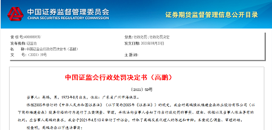 证监会8月31日更新的一则行政处罚决定书显示,证监会对高鹏操纵福建金森股票价格的行为进行了立案调查、审理,证监会决定没收高鹏5509万元的违法所得,并处以5509万元罚款。