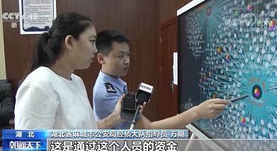 湖北省麻城市公安局经侦大队指导员 万刚:通过对资金的研判,发现有作案嫌疑的人员,这是通过这个人员的资金发散出来的涉案人员。我们通过这种研判发现关联的账户有一千余个,一千余个账户里面的流水信息量达到两千多万条。