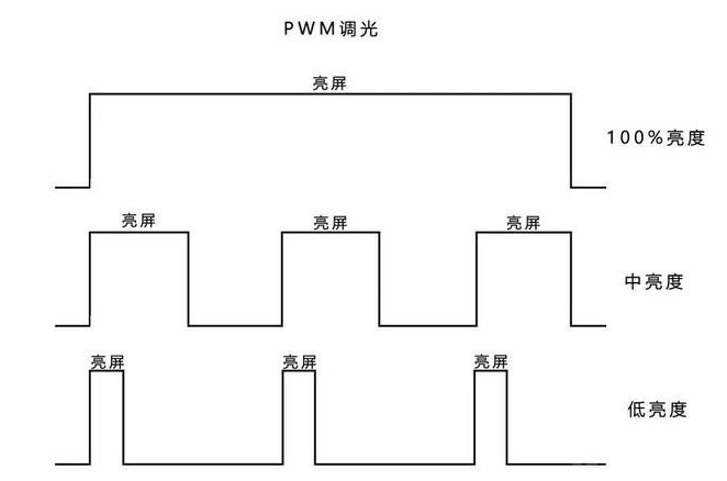 DC调光方式是指通过调整直流量变化来改变灯条电流(直流)的大小,从而调节屏幕亮度,如当背光LED灯电流变小时,屏幕亮度就相应变低。PWM调光方式却是通过控制背光一个周期内亮、灭交替时间来调节亮度,如下图所示。