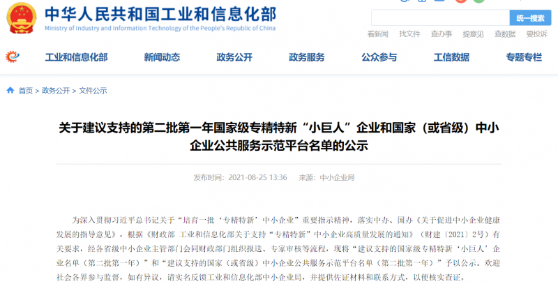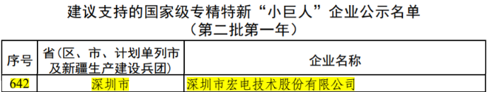 近日,国家工业和信息化部公示了《建议支持的第二批第一年国家级专精特新“小巨人”企业名单》,宏电股份以优异的综合实力入选。本次全国获批企业共656家,其中深圳市企业36家。