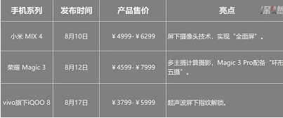 继7月底,华为P50系列以4G版本遗憾发布后,进入8月,其他国产手机厂商们都坐不住了。8月10日到17日不到10天内,便有小米MIX 4、荣耀Magic3、iQOO 8三个手机系列面世,被外界解读为,国产手机厂商们要在9月iPhone 13发布前,抢占先发优势。