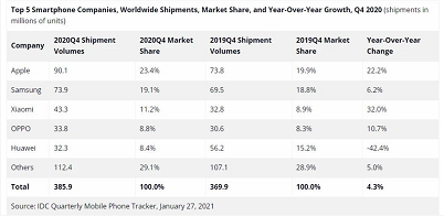 IDC:2020年Q4全球手机市场份额