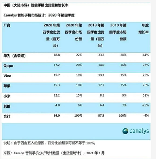 Canalys:2020年Q4中国手机市场份额