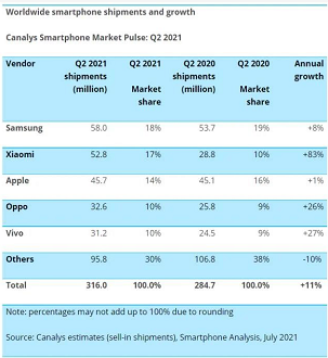 Canalys:2021年Q2中国手机市场份额