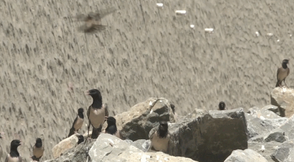 在伊宁县托乎拉苏草原一处道路建设工地,听不到大型机械的轰鸣,也见不到工人繁忙劳动场景,走进项目现场,一片叽叽喳喳的鸟叫声,现场堆积着许多用于修葺边坡的石头,上面聚集了很多粉红椋鸟,它们时而上飞舞,时而盘旋嬉戏,时而俯冲掠食,附近路过的车辆也会减速行驶,以免惊吓到这些鸟儿。