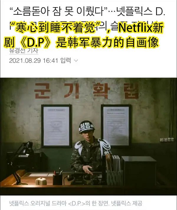 近日,一部聚焦韩国军队内部暴力、性骚扰事件的韩剧《D.P.》(Deserter Pursuit,逃兵追缉)在韩国引发高度关注,其中各种事件令人惊骇,比如老兵试图往新兵嘴里吐痰、将新兵摁在有钉子的墙上殴打,但不少服过兵役的韩国网民表示,故事非常“真实”,再怎么描述也不为过,韩媒《京乡新闻》甚至直接盖章“这是韩国军队自画像”。