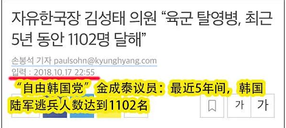 2018年,有韩国议员透露,从2014年到2018年的5年间,韩国陆军逃兵人数达到1102名,其中普通士兵最多,为951名。按年份来看,2014年逃兵人数最多,为426名。为何要逃离军队?大多人表示,对军队气氛不满。