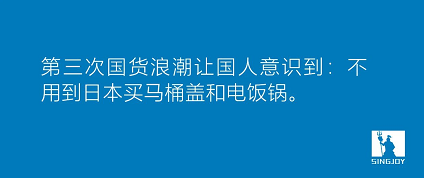 如果说,第二次国货浪潮是国货的复苏,从此中国有了自己的行业标准,那么,这次国货浪潮就意味着,国货广泛取代洋货,让国货真正与洋货分庭抗礼。通俗地讲,第三次国货浪潮让国人意识到:不用到日本买马桶盖和电饭锅。