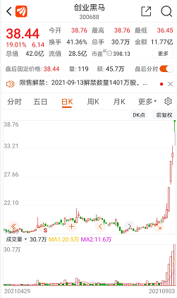 数据显示,9月13日,创业黑马将迎来占总股本12.83%的定向增发机构配售股份解禁。按此计算,此次解禁股份合计1400.90万股,按昨日收盘价计算约合5.4亿元。再加上上述的拟减持金额,创业黑马将面临近6亿元出逃的压力。