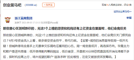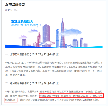 但监管对此却并不认同。深交所微信公众号在“深市监管动态”栏目中指出,8月30日至9月3日,本所对近期涨幅异常的“创业黑马”进行重点监控,并及时采取监管措施。显然是由创业黑马本周的巨大涨幅引起的。