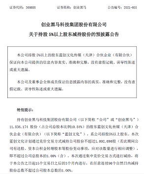 同时在股价连续大涨后,创业黑马9月3日公告称,公司近日收到股东蓝创文化出具的《关于股份减持计划的告知函》,将于本公告之日起15个交易日之后的3个月内进行,在任意连续90个自然日内减持股份总数不超过公司股本总数的1%,减持原因为应蓝创文化部分合伙人要求。